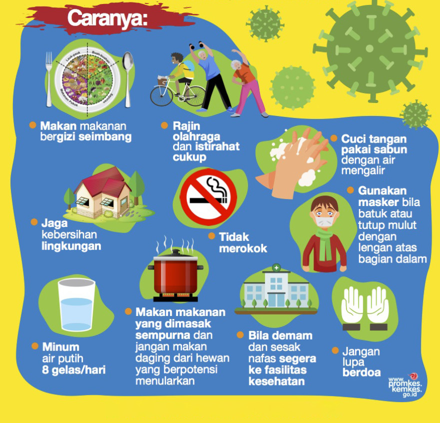 - Cuci tangan dengan sabun dan air mengalir selama minimal 20 detik, atau dengan hand sanitizer yang mengandung alkohol, terutama sebelum dan sesudah bersin, batuk, atau makan, juga sehabis dari toilet.